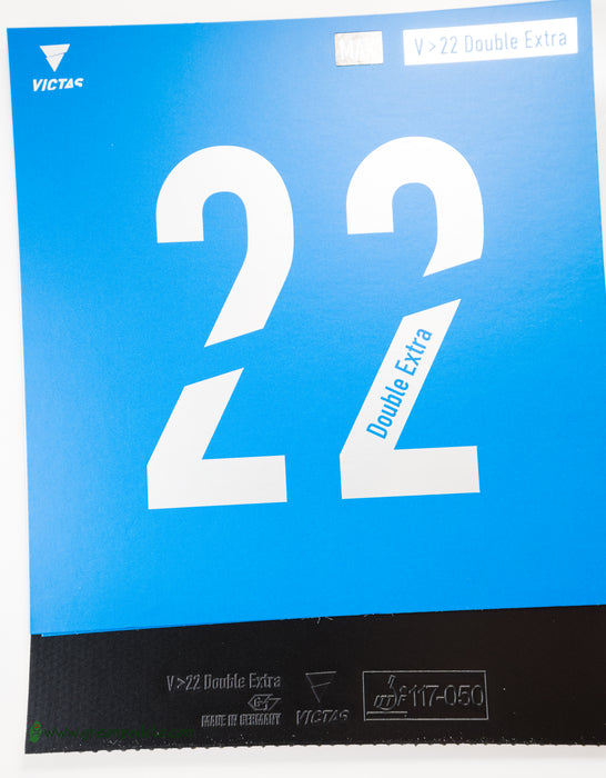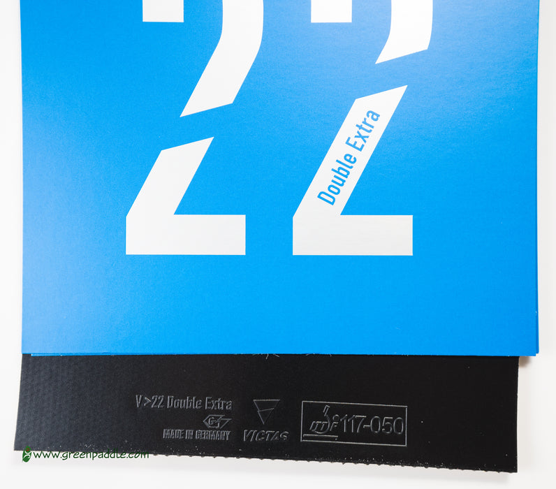 Are you ready for the next level of rubber innovation? Numerous top players like Koki Niwa and Benedikt Duda were involved in many years of development leading to V > 22 Double Extra, a rubber offering almost unbelievable speed and spin ratings. The new Select top sheet guarantees perfect coupling of the ball, while the optimized, open-pore sponge design additionally supports powerful, speed-reliant attacking styles. Despite its unrivalled power, the high stability of V > 22 Double Extra enables highly precise placement of your own attacks.